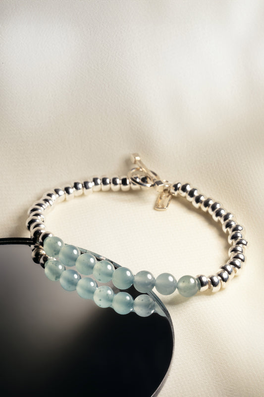 Bead Bracelet - Bluish Green Jadeite Beads & 925 Silver Nuggets - #15