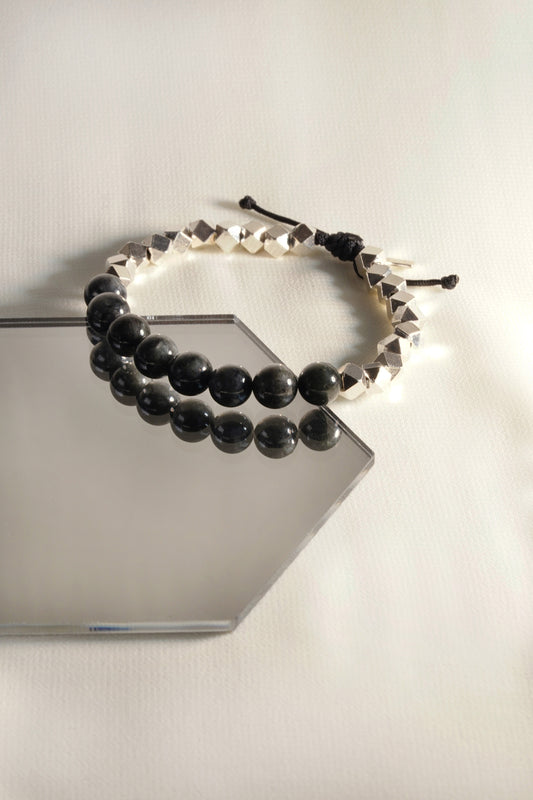 Bead Bracelet - Black Jadeite Beads & 925 Silver Nuggets - #05