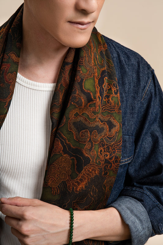 Green Square Silk Scarf with Dragon Motif